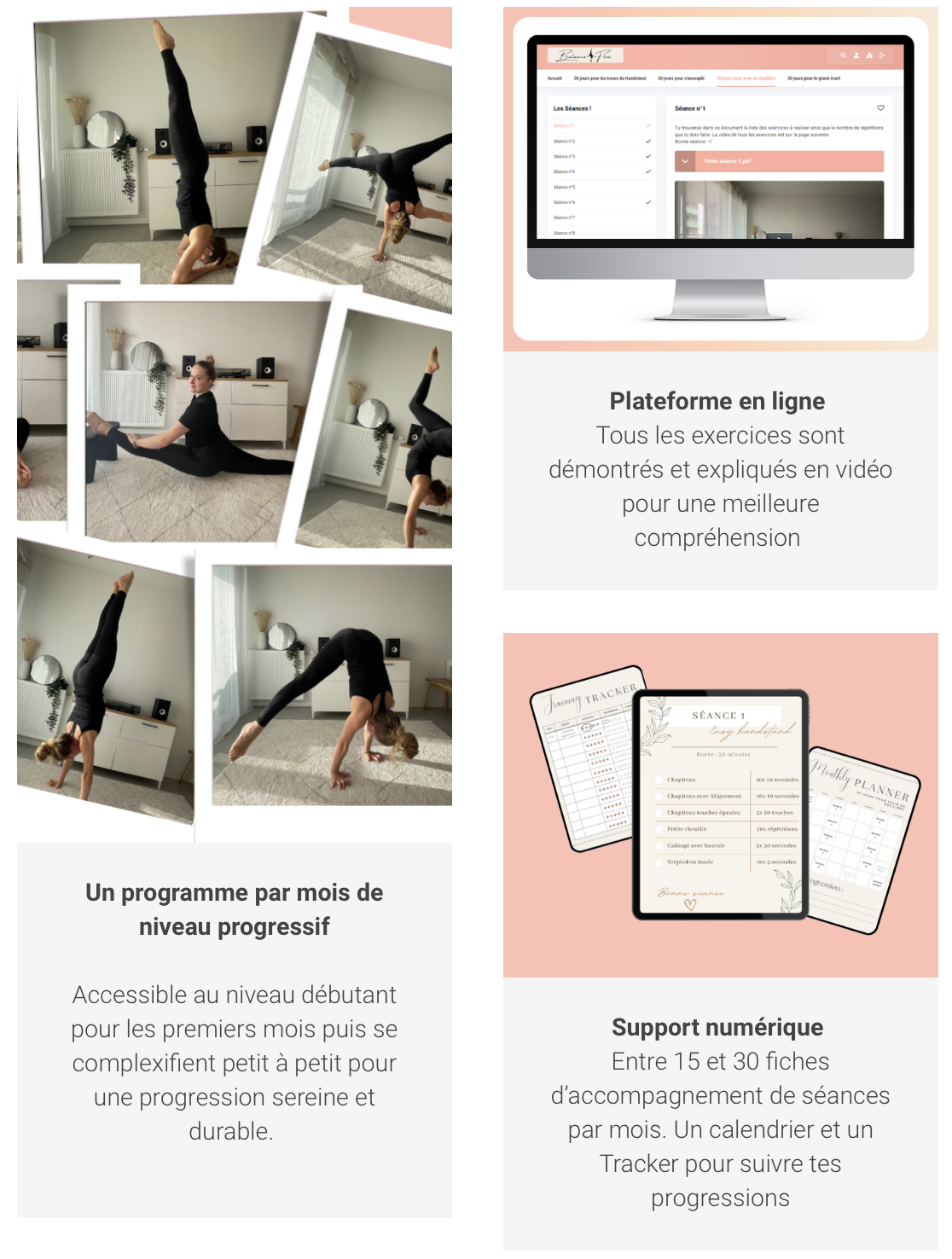 Entre 15 et 30 fiches d’accompagnement de séances par mois. Un calendrier et un Tracker pour suivre tes progressions